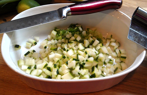 While that is simmering, chop cucumber and green onion and slice lemon in half.