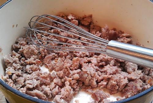 Your sausage will need to be stirred, poked and prodded to get that nice crumble. I like to use a whisk.