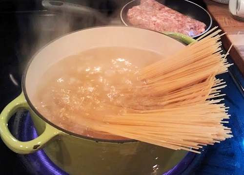 In a large pot, add water and salt for pasta and get that started.