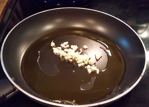 In a pan add the oil and garlic and let the pan warm up.