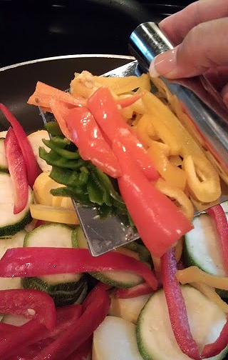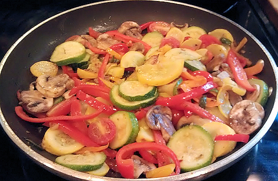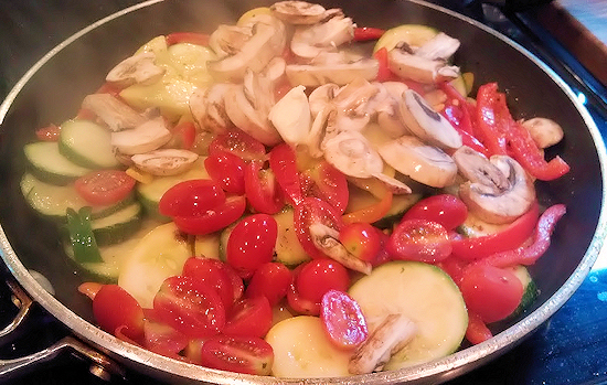 Add the veggies starting with the squashes and peppers then adding in the mushrooms and tomatoes about 5 minutes after the squash and peppers.