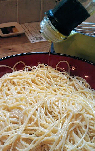 Rinse the pasta in the strainer and shake off. Pour directly into a large serving bowl. Drizzle about 1/4 cup of olive oil over the pasta. Toss a little.