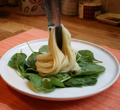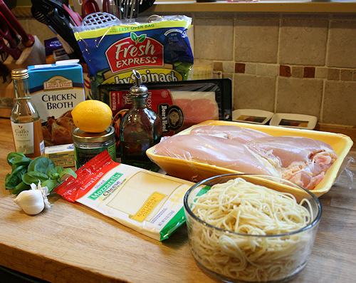 Pretty, huh? I chose to put mine on top of fresh spinach and pasta. I love pan sauces and pasta. While the pan is still hot, add the tbs of butter, remaining lemon and garlic to the chicken drippings.