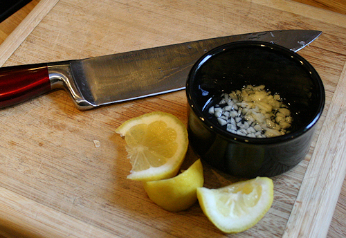 When done, set aside and get your pan ready. Chop your garlic and add the squeezed lemon juice(or 2 tbs of juice) to a ramekin. Add the olive oil and half the garlic and lemon from the ramekin into the pan and heat.