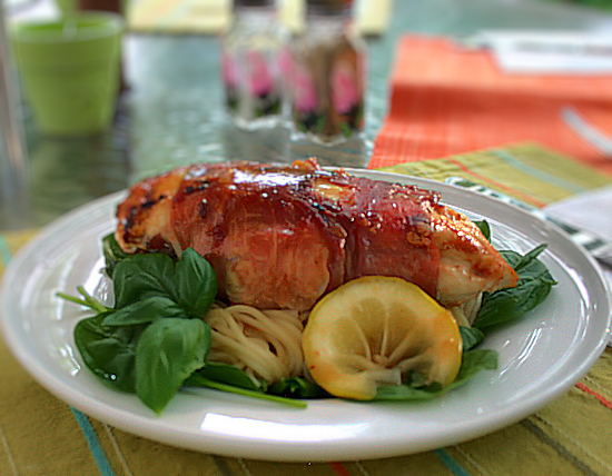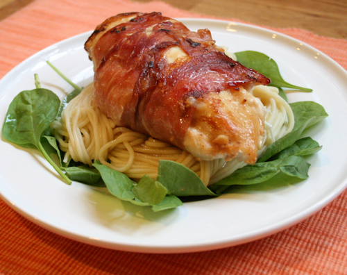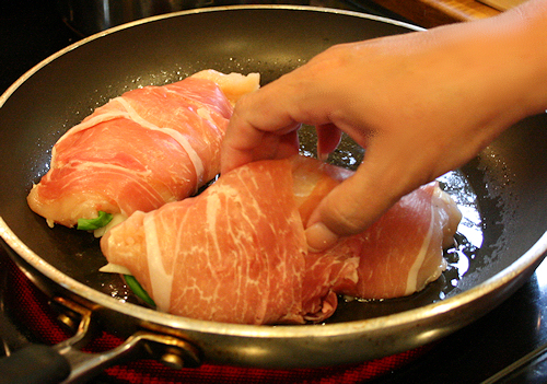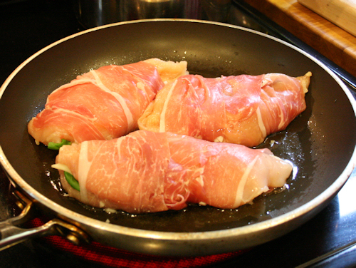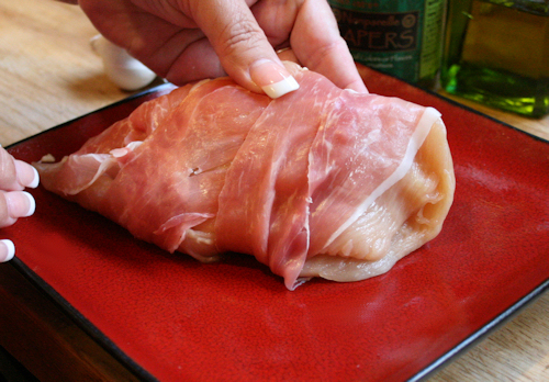 Fold over the chicken top and close. Grab two pieces of sliced prosciutto and wrap around the breast. It does not need to be tight. It will stick on its own.