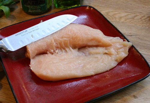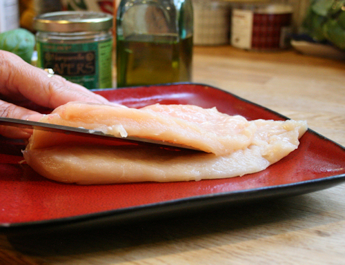 First thing is to get the chicken prepped and ready to stuff. Rinse each piece of chicken. Lay the chicken on a clean plate and use a sharp knife to carefully slice evenly through the middle or create a pocket. Make sure not to slice all the way through, separating the chicken.