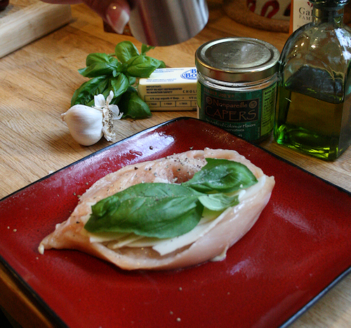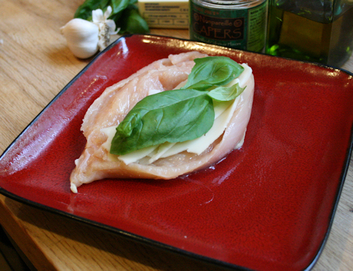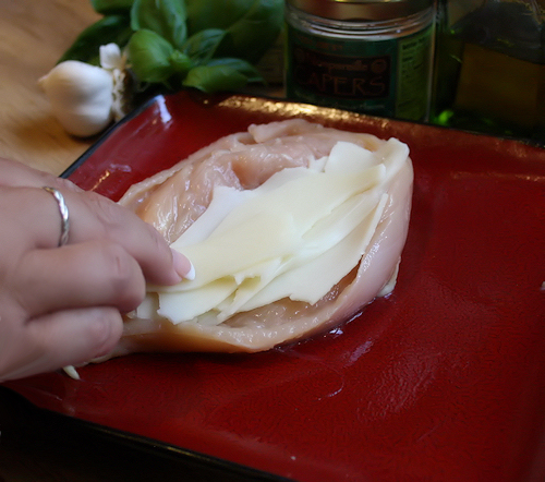 When each piece is cut, they are ready to stuff. Open up the breast so you can place the cheese and basil inside.