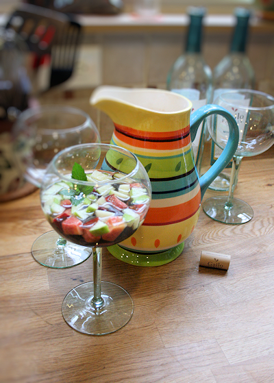 sangria6At this point, I usually set it in the fridge for at least an hour to chill and let the flavors of the fruit incorporate into the wine and vice versa.