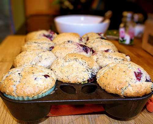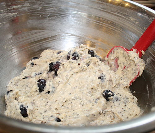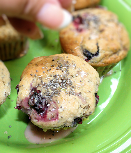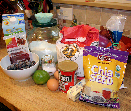 Last week, I received some organic chia seeds from Nutiva to try. I had to really think hard to figure out what I was going to do with these seeds. I’m well aware of the health benefits to them. Revered by the early Aztec and Mayan cultures, chia seeds are a superfood packed with fiber, protein, omega-3 fatty acids and antioxidants. But alas, I have never tried them! My grandmother has them in smoothies, my mother touts of their goodness and my brother is an avid user as well. I set out to make a muffin. Not just any muffin though. If this was going to add a health benefit, then I wanted my muffin to have some health benefits as well! I used fresh blueberries, 100% pomegranate juice and fresh lime zest. These are going to be yummy! Thank you Nutivia!