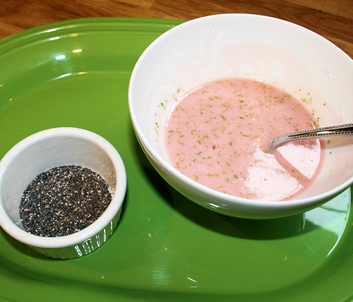 Now add your lime zest. (1/2 lime should do nicely) then squeeze a little bit to the mix, really just one squeeze is fine. Your drizzle is complete. Set aside about 1-2 Tbs of chia seeds for garnish.