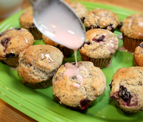 Take muffins out and transfer to a dish so we can drizzle each of these beauties.