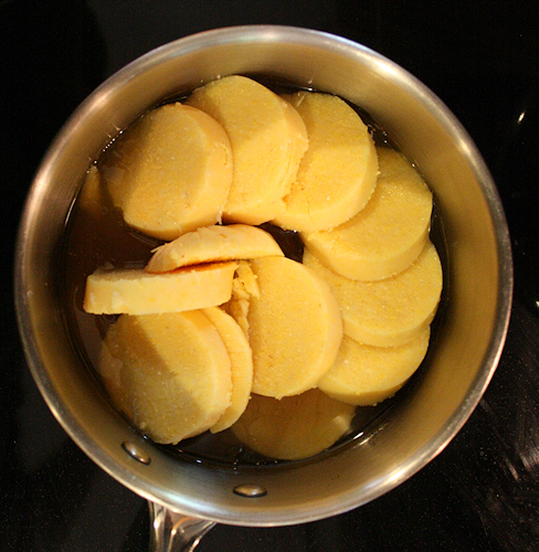 Add chicken stock to a quart sized pot, add the polenta slices and let it come to a simmer. It just needs to become hot. break up the polenta pieces with a fork some as it cooks.