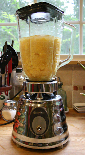 When the polenta and chicken stock come to a simmer it is ready to transfer into a blender. Any blender will do. We are just making this mixture smooth.