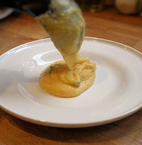 Start your plate by adding a heaping ladle of the creamy polenta. I used a shallow bowl.