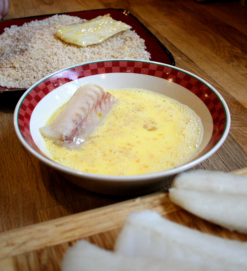 You will also need a simple eggwash to dip the fish in before the panko. 2 eggs and 1 cup of milk whisked.Dip each pc. of fish into the eggwash.