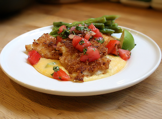 This is not at all what I intended to make tonight but my mind could not stop thinking about how to make creamy polenta out of that roll I had. I just didn’t like the sliced version. I have never had creamy polenta and I wanted to give it a shot. I knew the flavor profile I wanted; cheesy, smokey and crunchy with a little heat. This dish is what I came up with. Creamy polenta incorporated with some chicken stock, fresh parsley and cheddar cheese with panko crusted cod seasoned with Citrus Falksalt, smokey paprika, pepper and some kosher salt and a salsa that combined tomatoes, red onion, parsley, cilantro paste and some spicy sriracha sauce. Loved it!