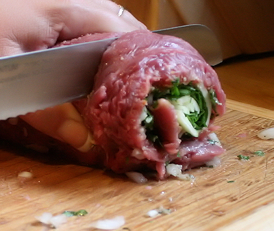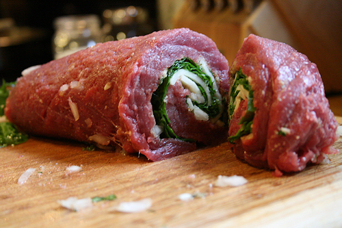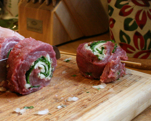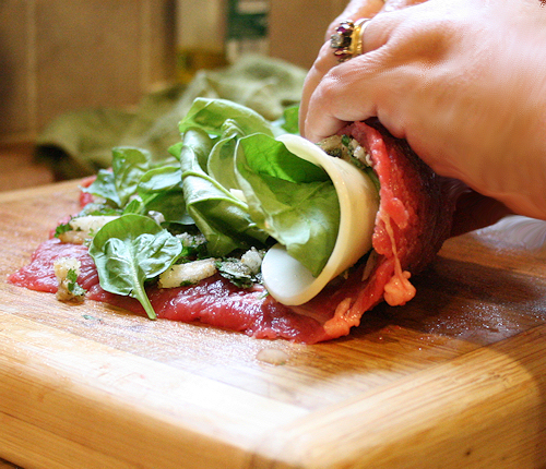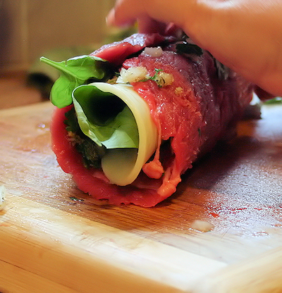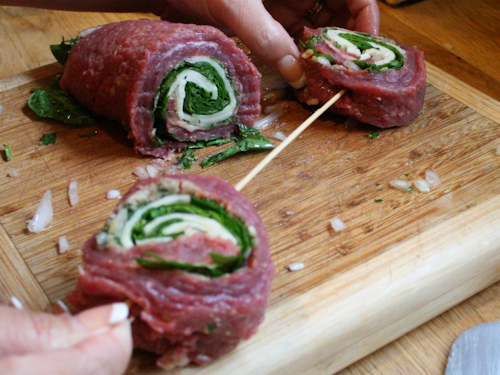 Take the end closest to you and roll up the meat and filling nice and tight, rolling away from you. Place the seam on the backside.