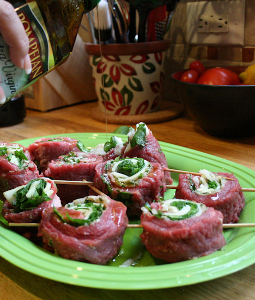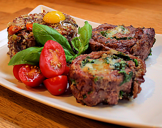 I bought these once at Fresh Market already done and they were delicious. Well, I got a heck of a deal on a very pretty piece of flank steak so I thought I’d try my hand at this. I mean, I know what it is supposed to taste like, I am pretty good at grilling steak and I will stuff anything that doesn’t move with cheese! They came out really nice; rich and they had a buttery texture like the perfect fillet. The flavor from the garlic and parsley went really nice with the spinach. I love how pretty they are when they are on the skewer for a really nice visual presentation. This is perfect for date night. I served this with veggie quinoa topped with a decadent quail egg.