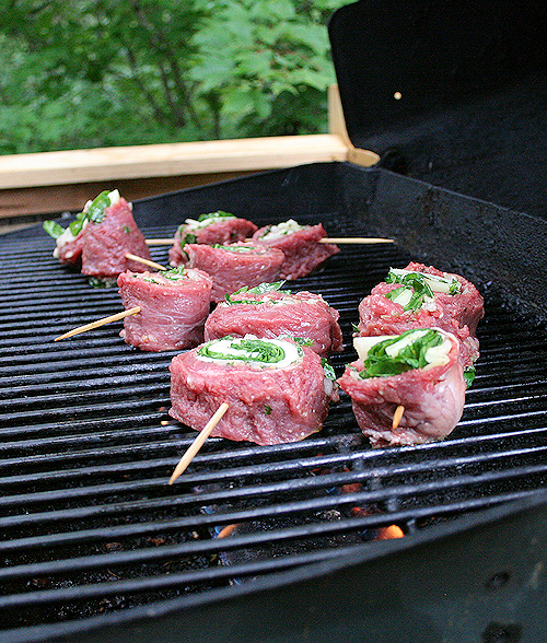 Grill pinwheels right over the hot side of grill until you have a nice color. It should take about 4 to 6 minutes. Using tongs, flip each pinwheel and grill on the opposite side until it is also well browned, about 3 to 5 minutes more.