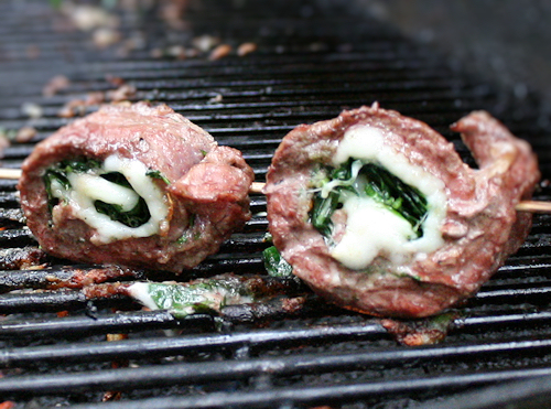 I find the breadcrumbs cut down on the dripping of the cheese. When it is browned on the second side, move them to a cooler part of the grill, close the lid and continue to cook until the middle part of the flank pinwheel registers 125 degrees on a meat thermometer. This should take about 5 minutes more.