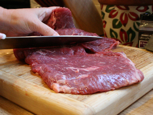 Next We want to butterfly the flank steak. Essentially, this means make two nice halves by cutting it through the middle. You will need a really sharp knife and it should slice like butter.