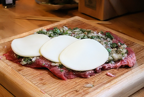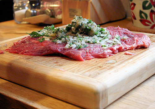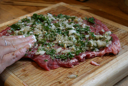 Now that this is laid out and as nice of a shape as we can get it, add your parsley mixture. Smear it into the steak nice and even.