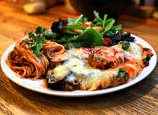 eggplant and cheese, eggplant parm, eggplant Parmesan, mozzarella bake, roasted eggplant, spaghetti marinara, vegetarian pasta