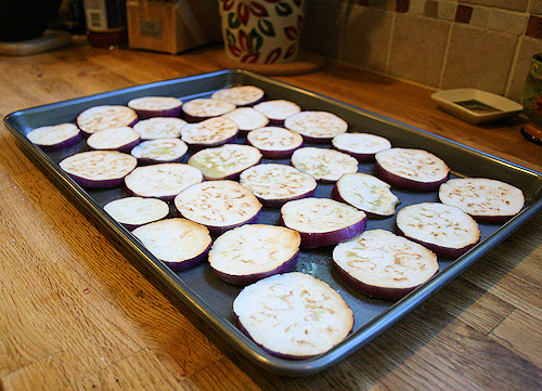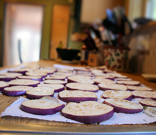 About an hour ahead of time, slice and lay out all your eggplant slices onto paper towels. The slices should be about 1/2 an inch thick. Sprinkle with a TINY amount of salt on one side of the eggplant slices and this will draw the liquid out.