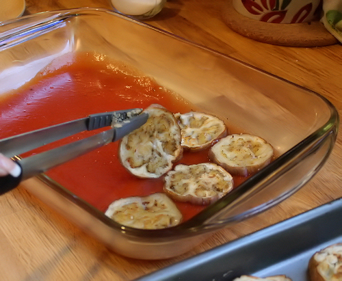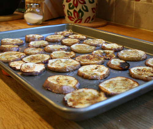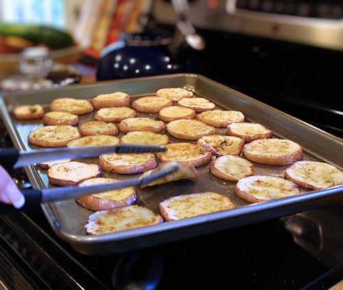 After 10min, take each pan out and flip the eggplants as well as rotate the pans. Now put your oven on Broil LOW and watch them. You want them to crisp up some. This will give a wonderful texture to the dish.