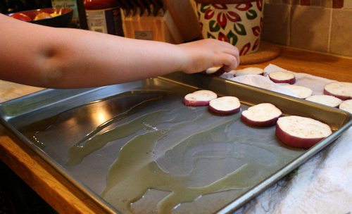 Once it looks like your eggplant is sweating, pat them dry with a paper towel and lay onto a lightly oiled baking sheet. We are going to roast the eggplant in the oven for 10 minutes. You will need two pans.