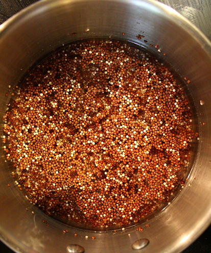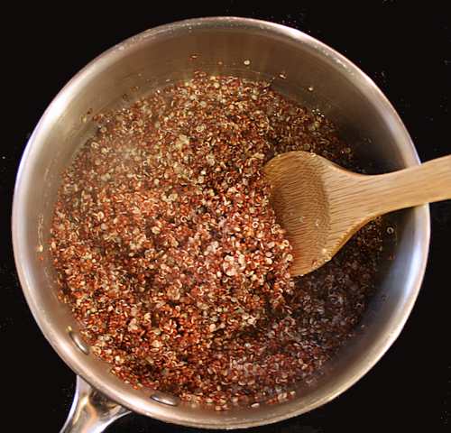 Quinoa is a lot like rice and a little like grits. It’s soft but grainy. Good thing though because you make it about the same way as rice. One difference is you don’t have to cover it because it is more forgiving. Bring the quinoa, water and 1 pinch of salt to a boil.