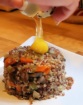 Delicately remove the top of the egg shell and pour the egg out onto the top of your quinoa.