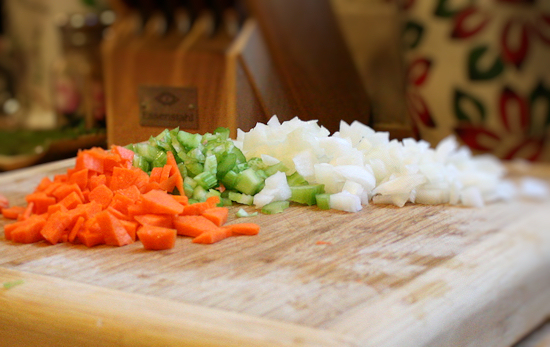 Next, add the carrot and celery and cook until the onions are translucent.