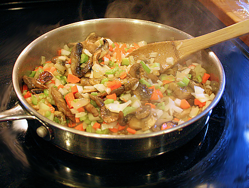 In a sauce pan, add the olive and over medium heat add the onion, garlic, and mushrooms. Peel your carrots before chopping. Dice the onion and celery.