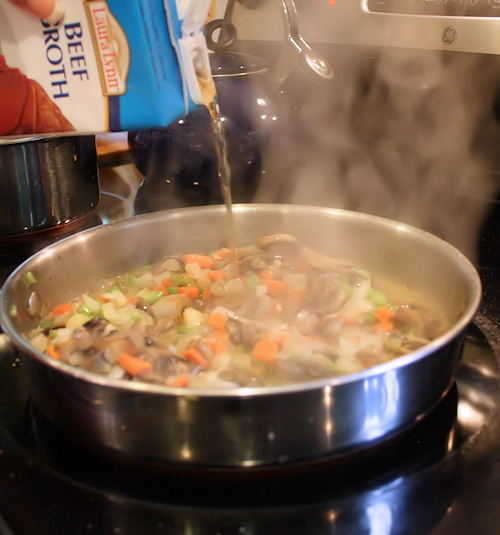 Add in 1 cup of beef broth and season with salt and pepper. Lower heat to med-low.