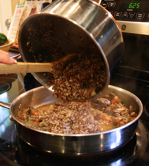Add in the cooked quinoa, simmer until the beef broth has been absorbed.
