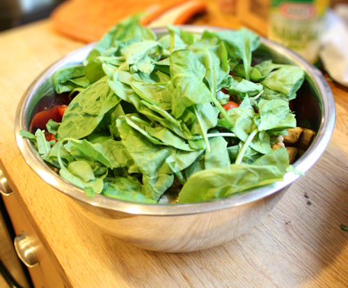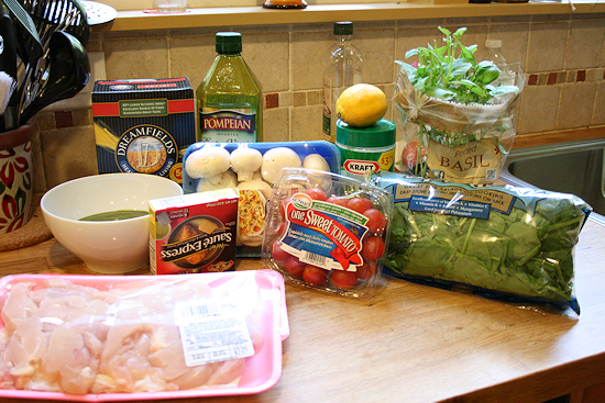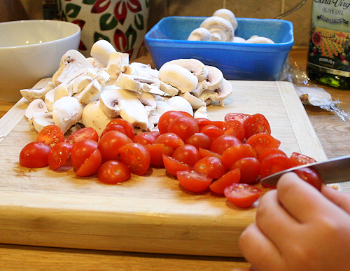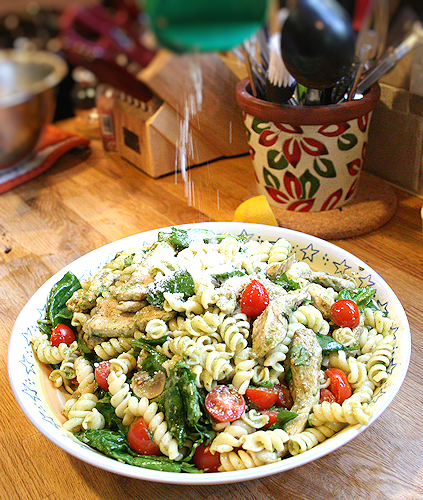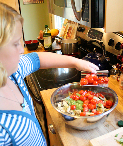 When we made this yummy pesto, we had to make something to go with it, right? So my daughter came up with her own recipe tonight and I let her roll with it. Not only was it wonderful, but I loved how she added special little touches like fresh spinach, mushrooms and cherry tomatoes. Nice to have a break and sit back and watch your little one create. We hope you enjoy it as much as we did.