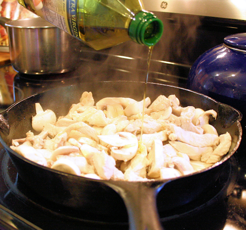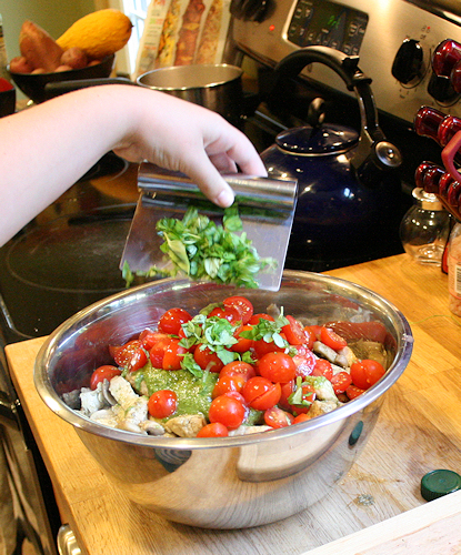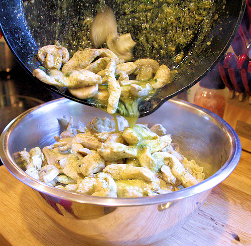 Add your chicken and mushrooms right into the bowl over the pasta.