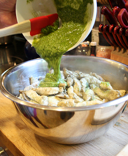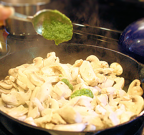 Add the fresh mushrooms and 2 tbs of Pesto into the chicken. Gently stir through. Simmer on low for about 10 minutes to let the flavor seep into the chicken and mushrooms.