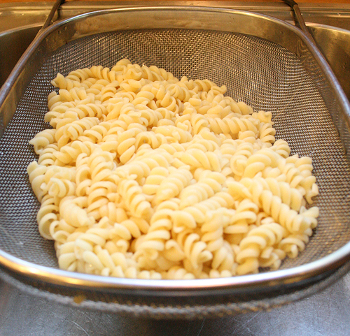 While the chicken is cooking, go ahead and cook your noodles. Set aside in a strainer to drain.