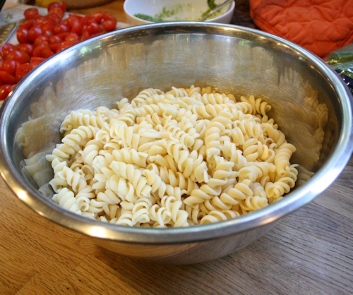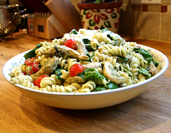 You want to make sure every bit of pasta is coated with the Pesto. Pour into your favorite serving dish and sprinkle the parmesan cheese right over the top.
