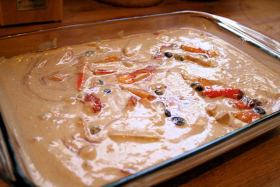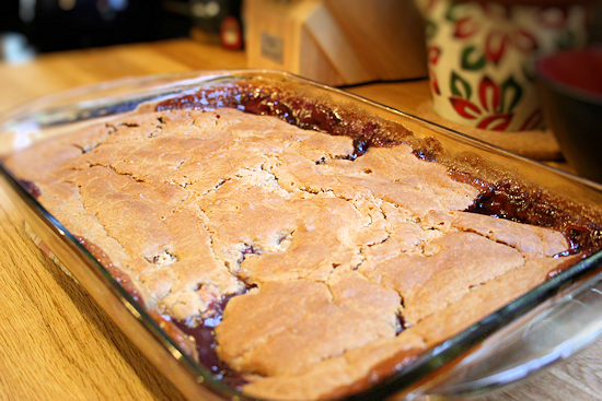 cob10cob11Take your batter and pour right over your fruit, then gently take a spoon and swirl the fruit through.  Just so some is poking through the top. Some people like it the opposite way as well, putting the batter in then the fruit on top. I will let you choose.