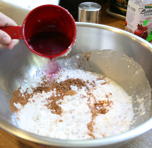 In a large bowl, add your dry ingredients. Then pour in the pomegranate juice and milk and mix until thoroughly combined.
