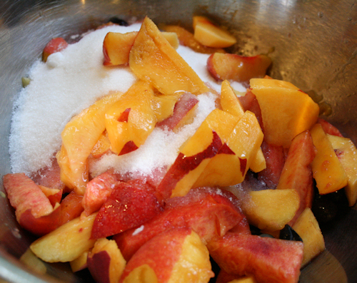 In a large mixing bowl, add your fruit and pour the sugar over giving them all a toss.