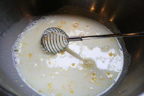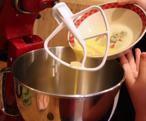 Use your paddle attachment if you are using a stand mixer. Pour in the eggs and whisk on medium high to get the eggs mixed in quickly.