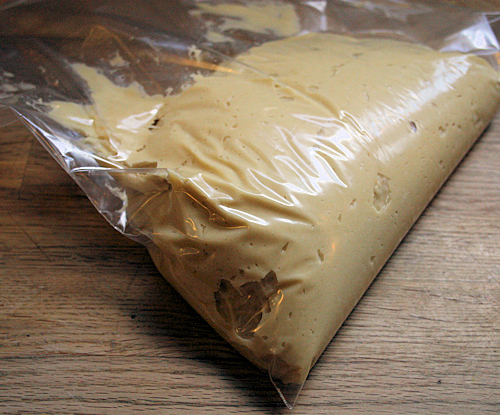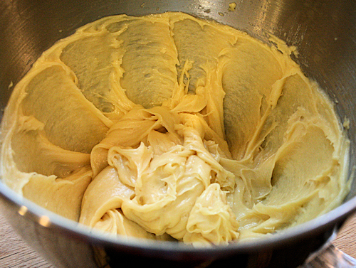 When the eggs are incorporated, the dough will become very shiny and slippery but still remain kind of gooey and thick.