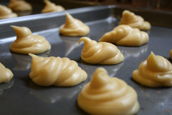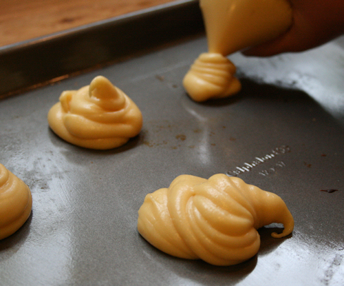 Squeeze the dough into the corner of the bag and pipe it onto a baking sheet into little puffs. Do not place them too close together.