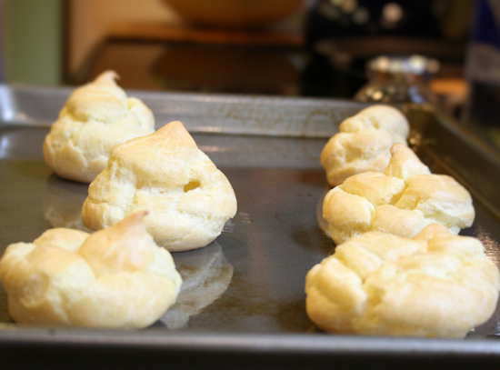 Don’t they look pretty? Like little clouds. Wet your finger and knock the little tips flat so they don’t burn in the oven. Bake at 425F for 10 minutes then turn the oven down to 350F and bake for an additional 20 minutes. If you have larger puffs, they may need to be cooked a little longer. Mine were about the size of a tennis ball maybe a little smaller.