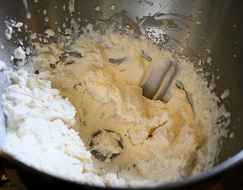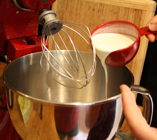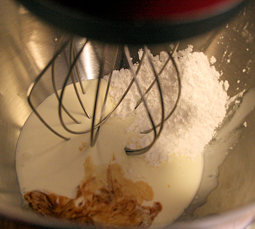 Take your whipping cream and pour into a mixing bowl and with a hand mixer or standing mixer, beat in the the powdered sugar, vanilla and salt.
