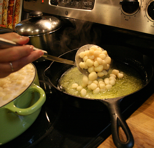 When your gnocchi begins to float on top of the water, you can begin to scoop them up and slide them into the butter and garlic.